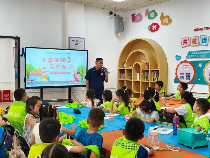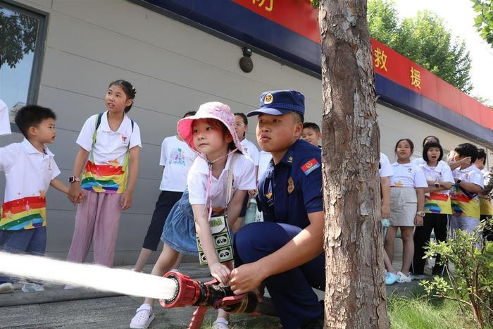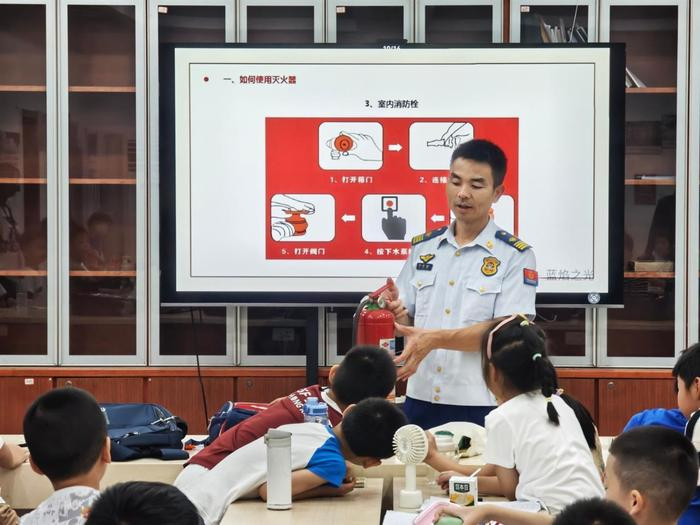 在汉阳区,消防部门联合永丰街道徐湾社区为暑期爱心托管班的小朋友们,开展了一场生动有趣的消防安全知识培训。消防员组织小朋友们观看消防安全教育动画片,还通过互动问答、体验参与等形式,带领孩子们近距离参观队站营区及灭火救援装备,详细介绍了灭火器、灭火救援服等器材的功能和使用方法,在沉浸式体验中加深对消防安全的理解。